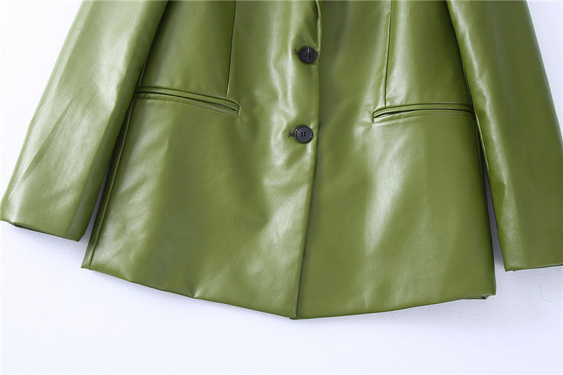Un ensemble audacieux en simili cuir vert, composé d’un blazer structuré et d’un pantalon élégant.