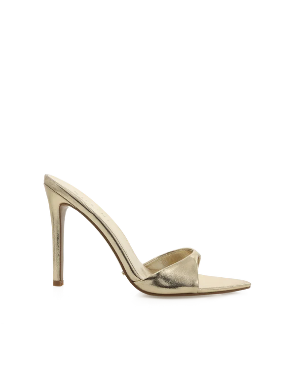 Les mules Dora de Vivatelle offrent un style audacieux avec leur design peep-toe et leur talon stiletto haut de 10,7 cm.